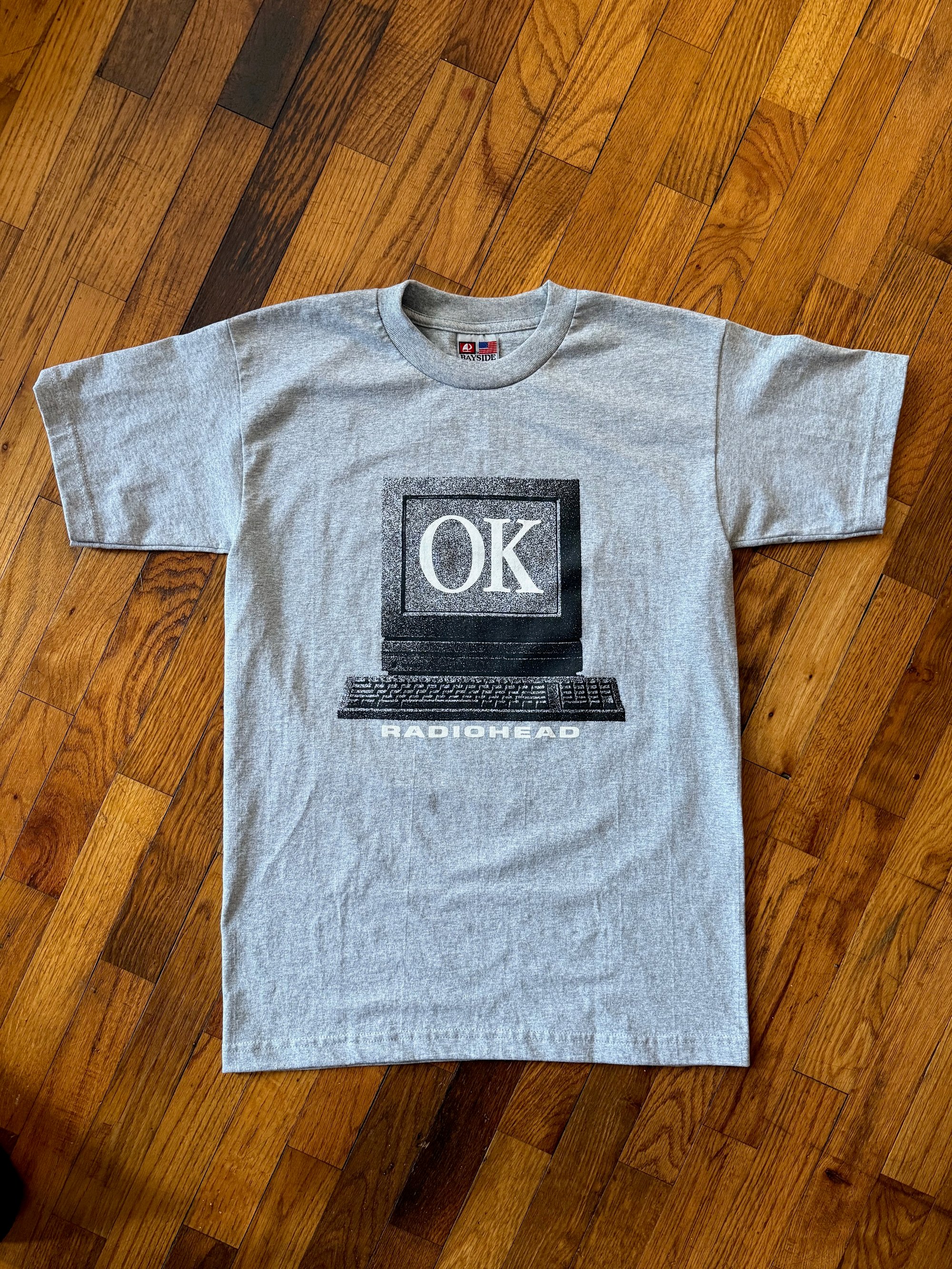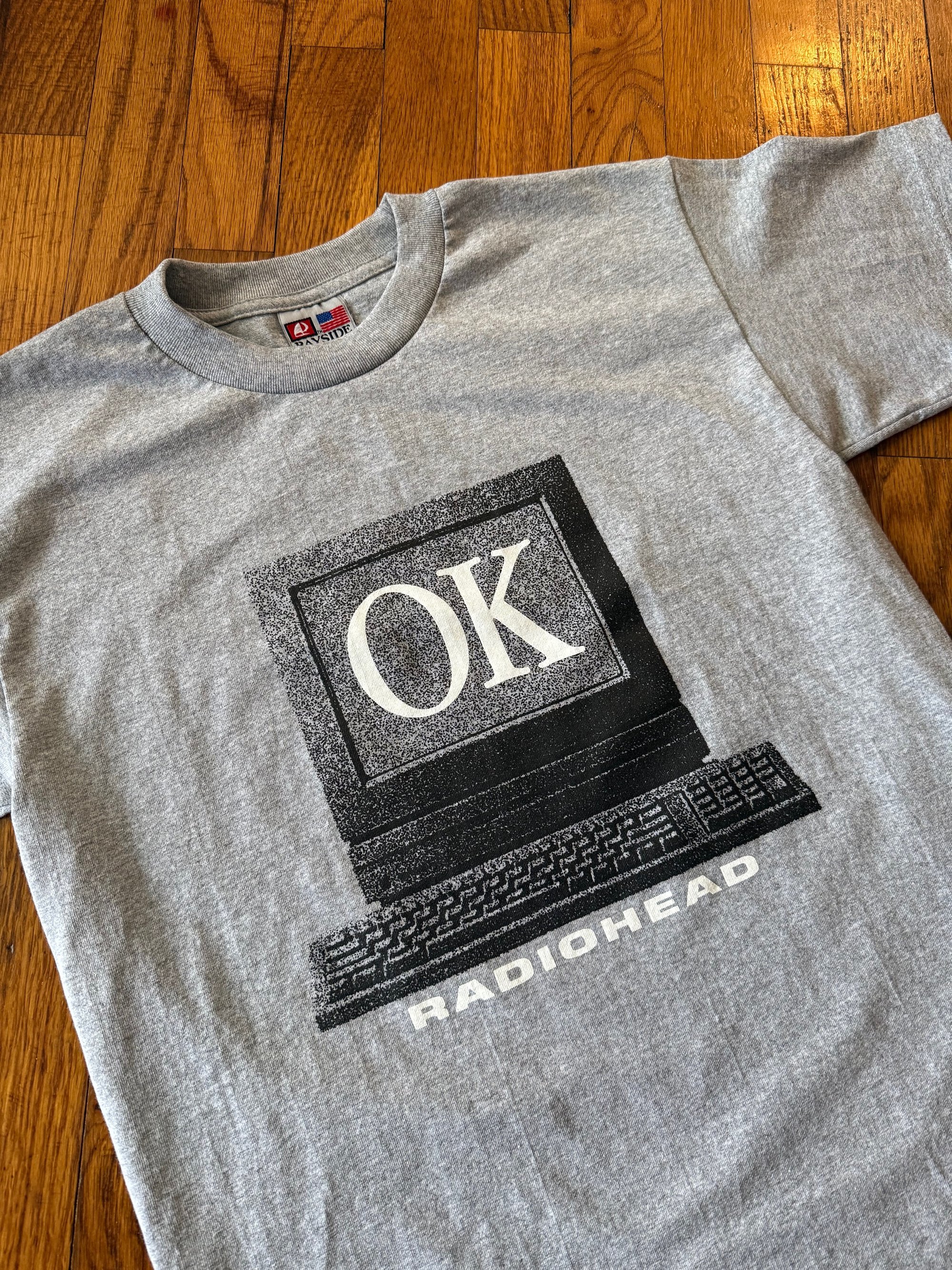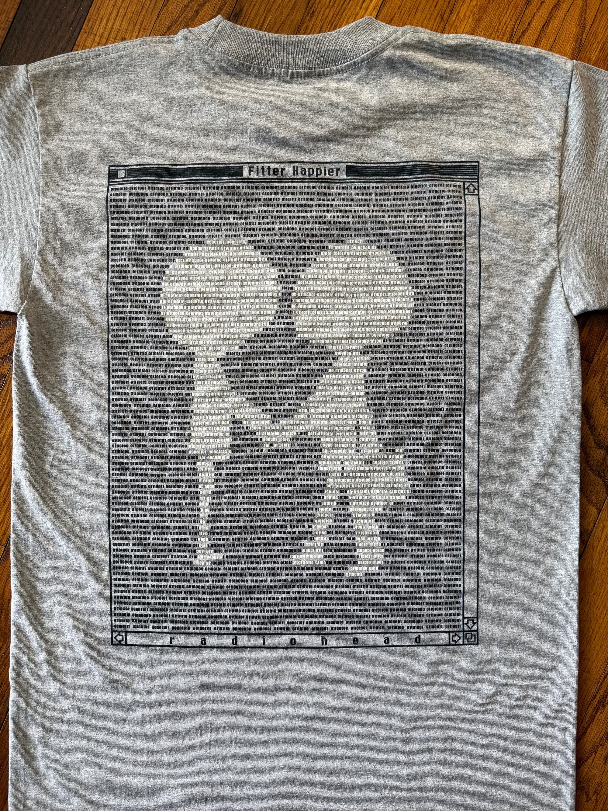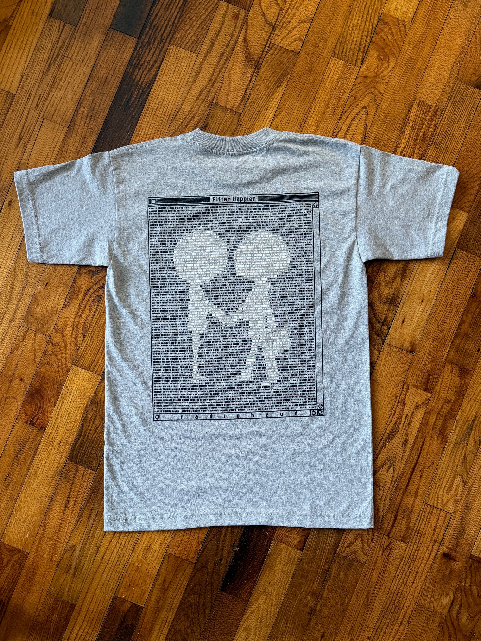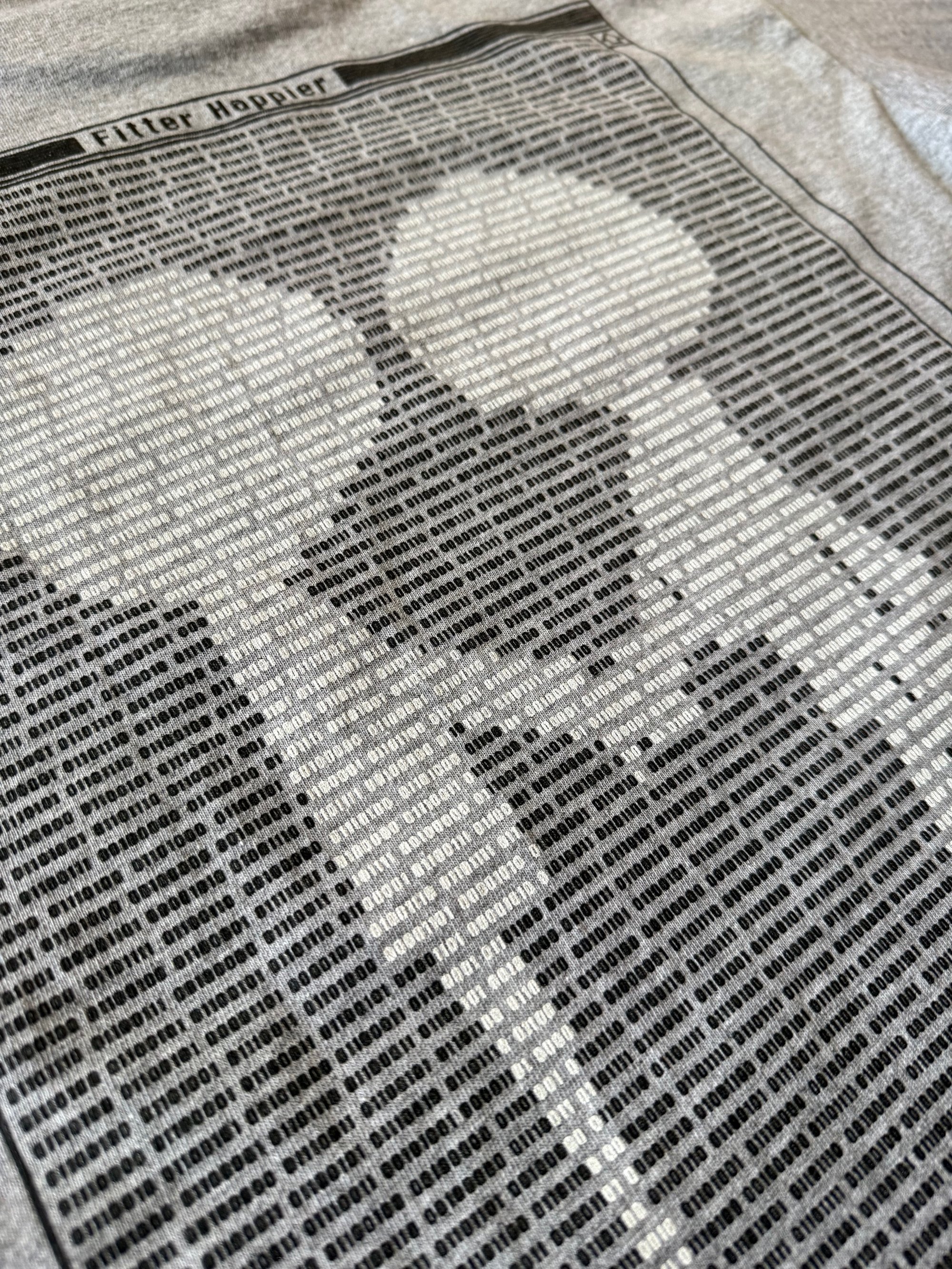 Manually screen printed using plastisol inks on Bayside Heavyweight Dark Ash 5100 blanks. Lyrics of the song Fitter Happier in binary on back of shirt. Front print is 10 x 11 inches Back print is 16.5 x 12.75 inches 2 color print on front and back